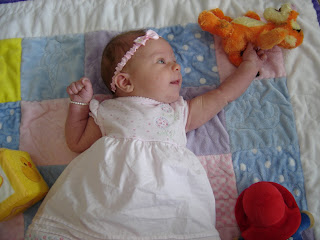 Angie is now tracking things with her eyes and is reaching out for her toys. She is not able to grab her toys yet but sure is trying. Her favorite way to play is partially rolled onto her side which she can do on her own as seen in this picture. She is such a strong baby.